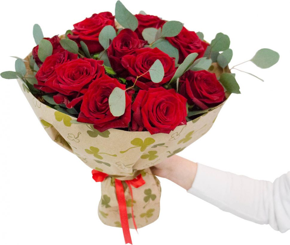 5 красных роз, эвкалипт, зелень, упаковка, лента9 красных роз, эвкалипт, зелень, упаковка, лента15 красных роз, эвкалипт, зелень, упаковка, лента